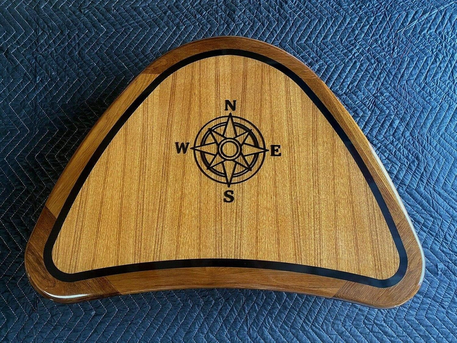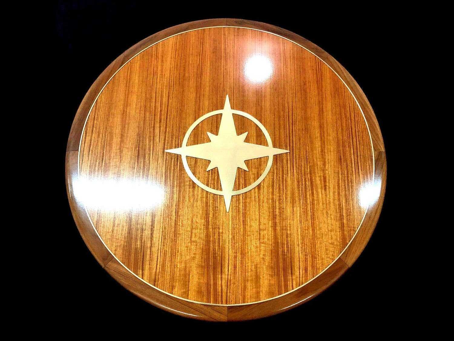 Solid teak table top original style with curb and compass rose. Hardwood compass rose wood inlay & marquetry. They can be customized by wood species, style, sizing, shape, and more. Compass rose inlay in cherry wood table with high gloss epoxy finish. 22 by 42 oval teak yacht/boat/rv table gloss stainless compass rose and inlay.